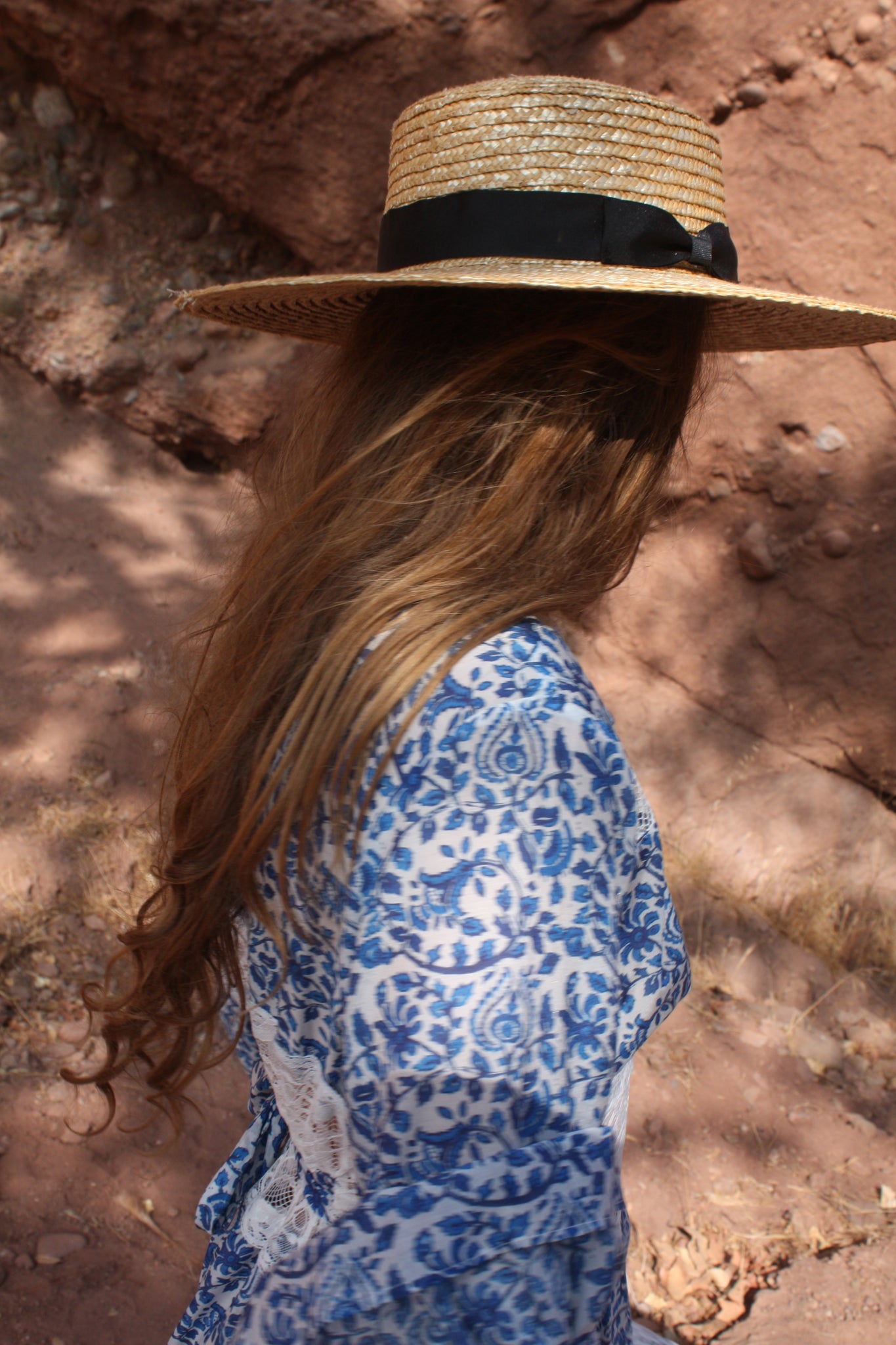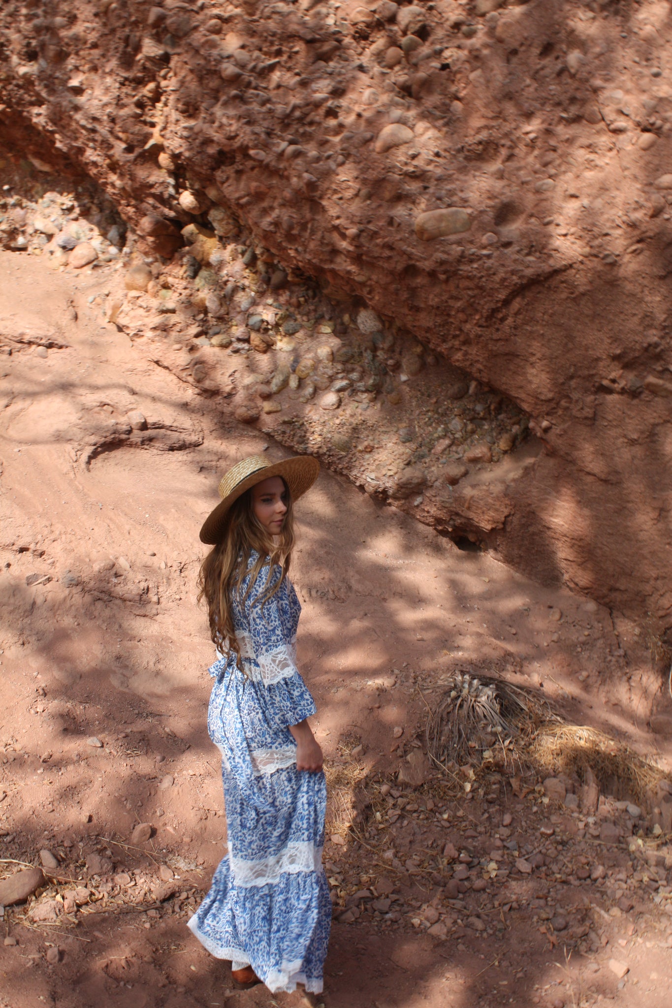 The Lavender dress is dreamy in our blue and white Lakshmi print. You can adjust the fit with the tie making this piece complimentary to any body type . The flowing silhouette with romantic lace trim and bell sleeves is for the women who walks in fields of flowers.