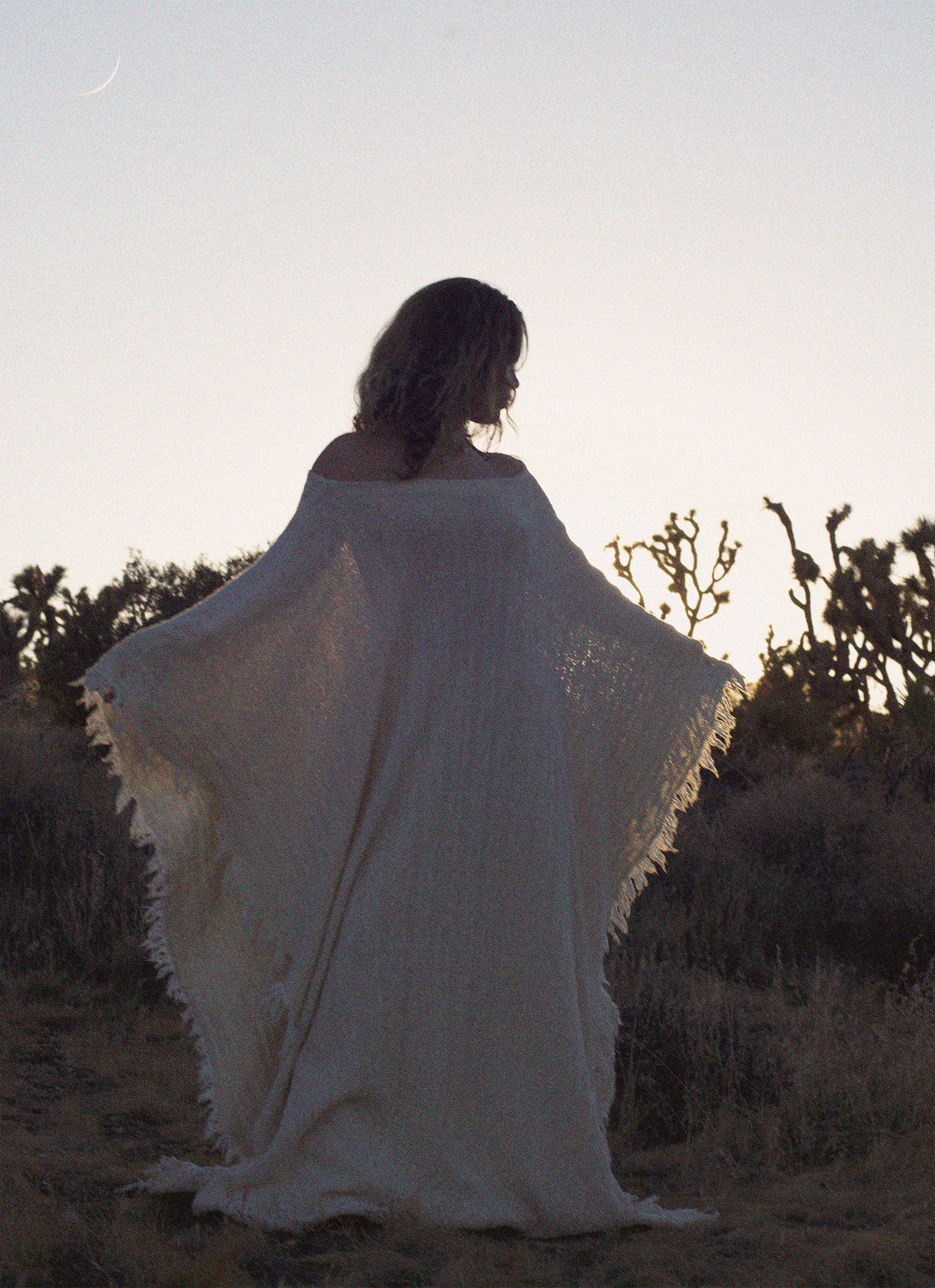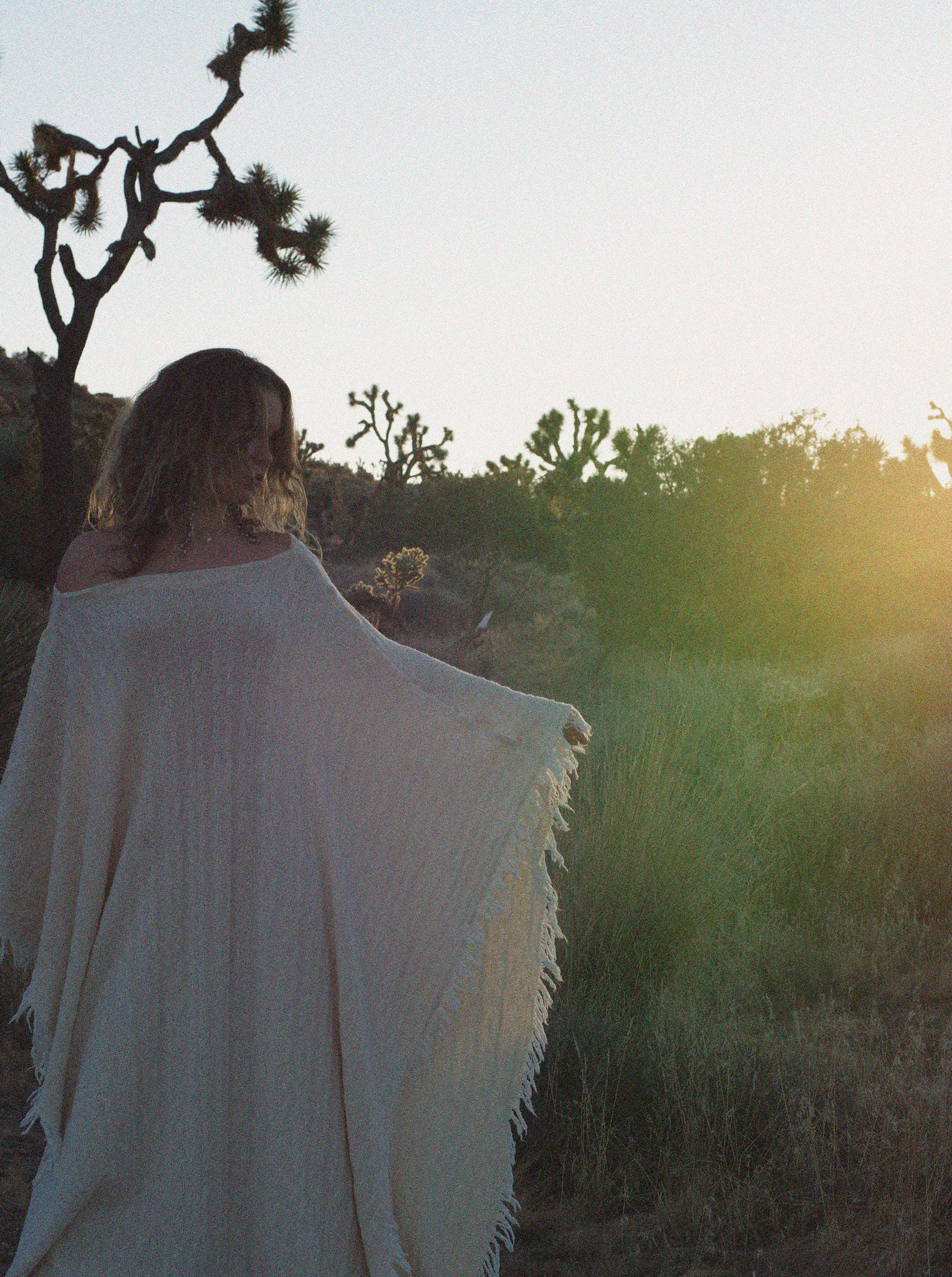 I hand make each piece in Joshua Tree, using upcycled, knitted cotton that’s naturally dyed with the sun and tea for a warm ivory hue. Open at the sides and designed to be worn off or on the shoulders, this piece is ceremonial yet grounding, rooted in the spirit of California windswept and cultivated.
